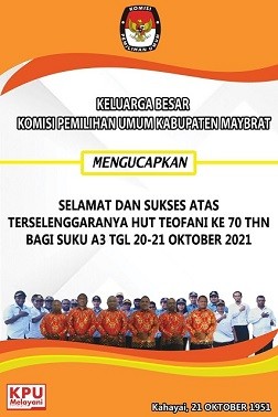 HUT TEOFANI KE 70 Rabu, 20 Oktober 2021 00:00 624 KELUARGA BESAR KOMISI PEMILIHAN UMUM KABUPATEN MAYBRAT MENGUCAPKAN SELAMAT DAN SUKSES ATAS TERSELENGGARANYA HUT TEOFANI KE 70 THN BAGI SUKU A3 TGL 20-21 OKTOBER 2021 Baca Selengkapnya