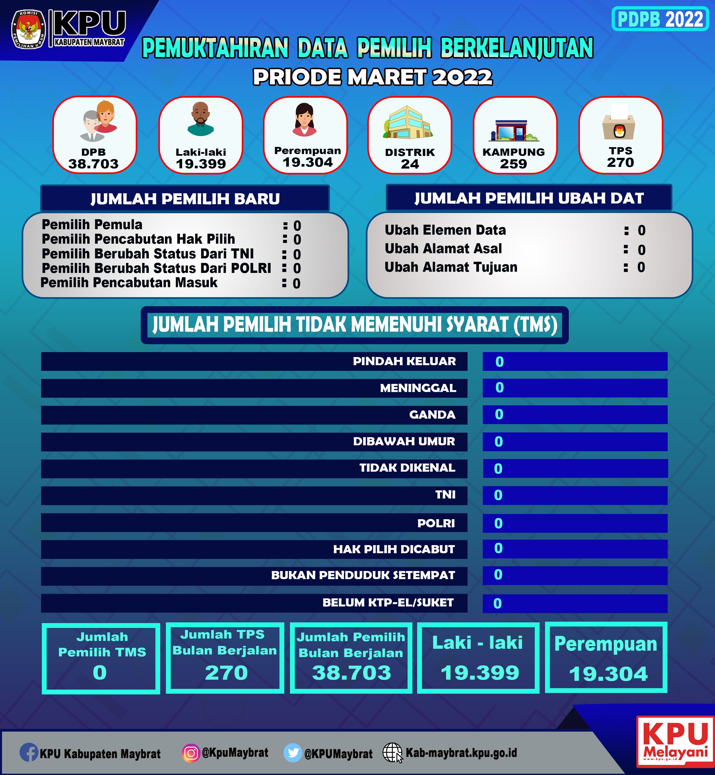 Pemutakhiran Data Pemilih Berkelanjutan Priode Maret 2022 Kamis, 01 Januari 1970 07:00 588 KPU Kabupaten Maybrat Pada Tanggal 04 Maret 2022 Telah Melakukan Rakoor Pemutakhiran Data Pemilih Berkelanjutan Baca Selengkapnya