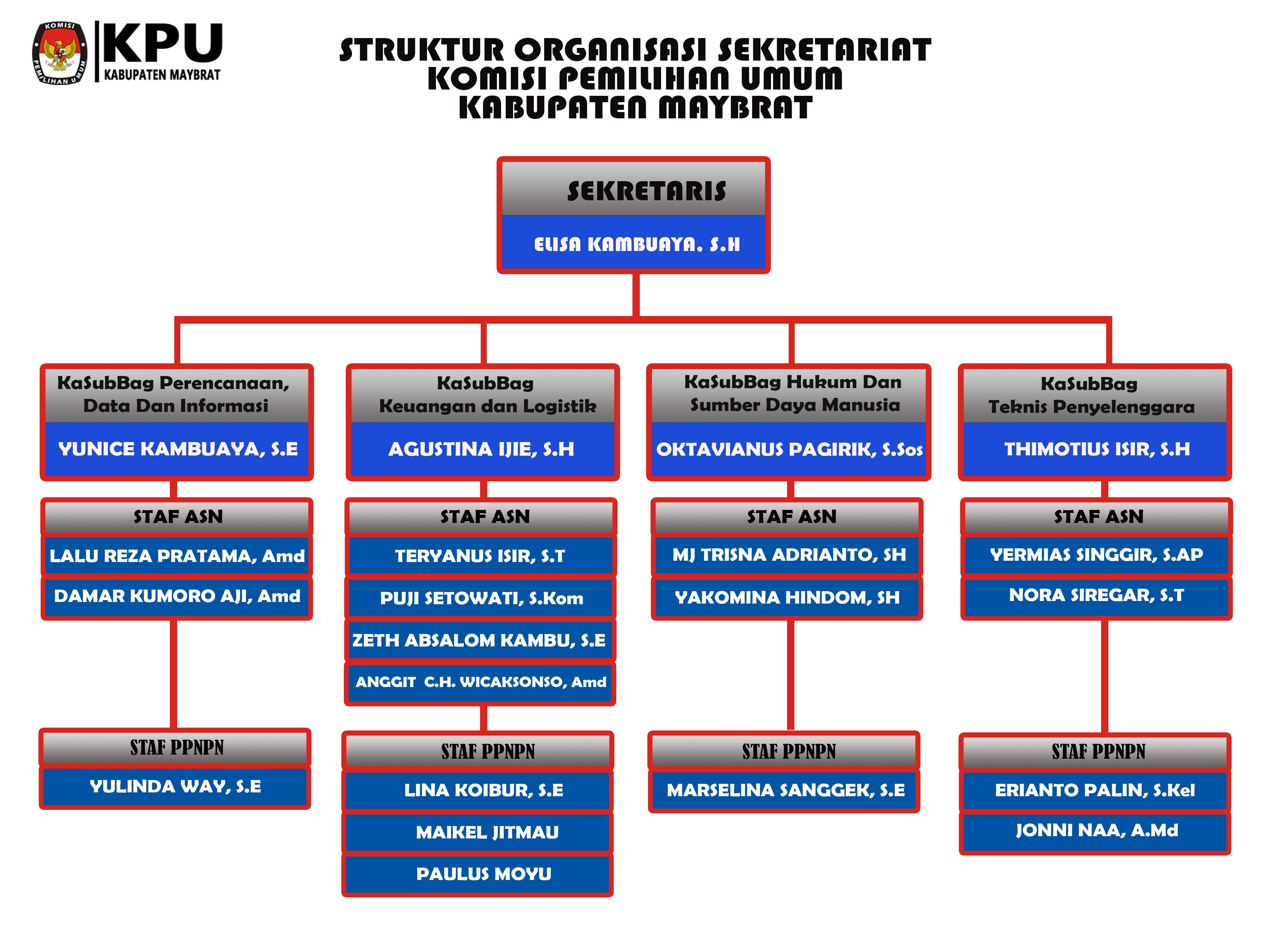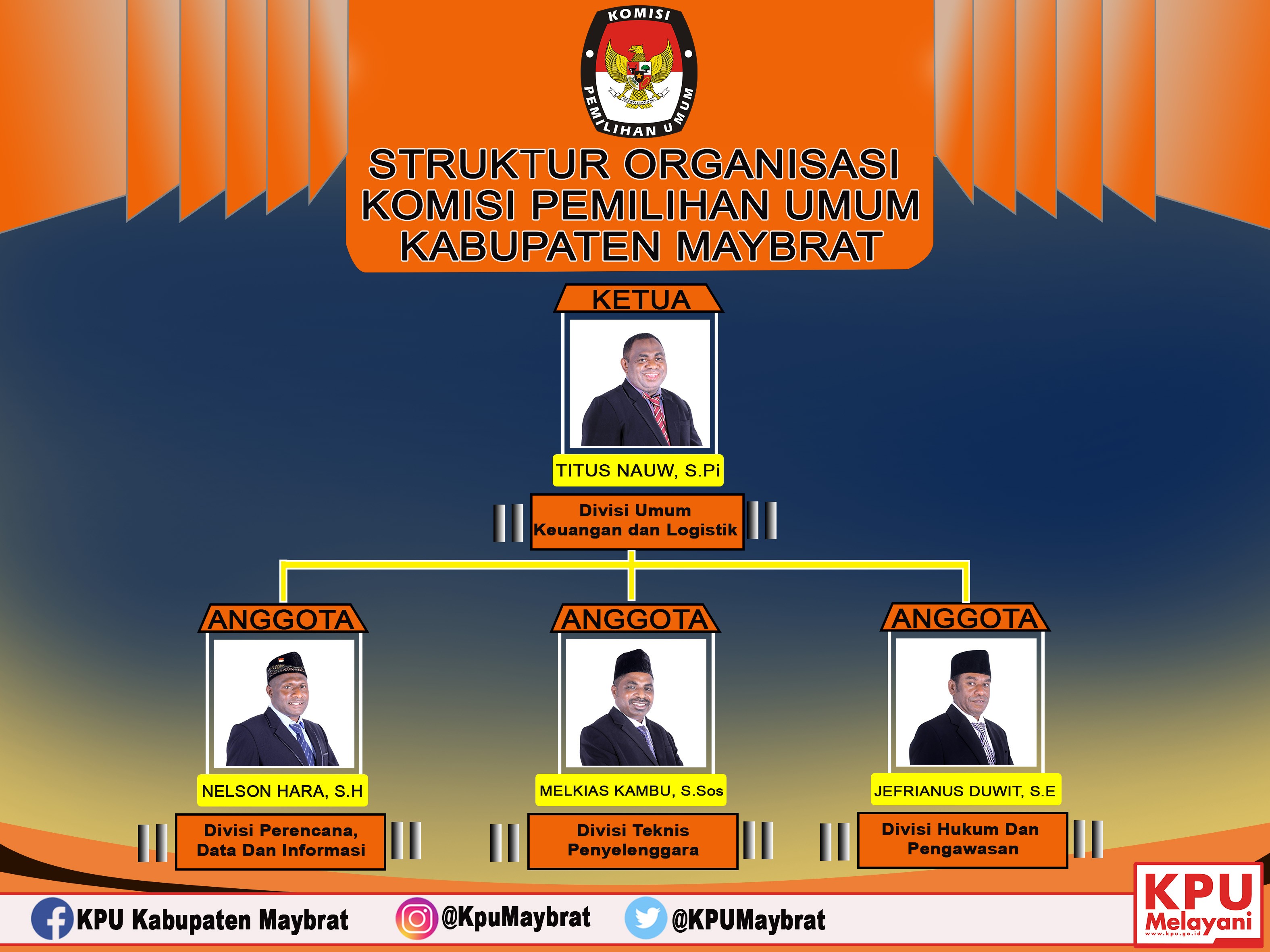 Struktur organisasi KPU Kabupaten Maybrat terbagi 2 yaitu struktur komisioner dan struktur sekretariat untuk detail terlampir gambar dibawah ini.